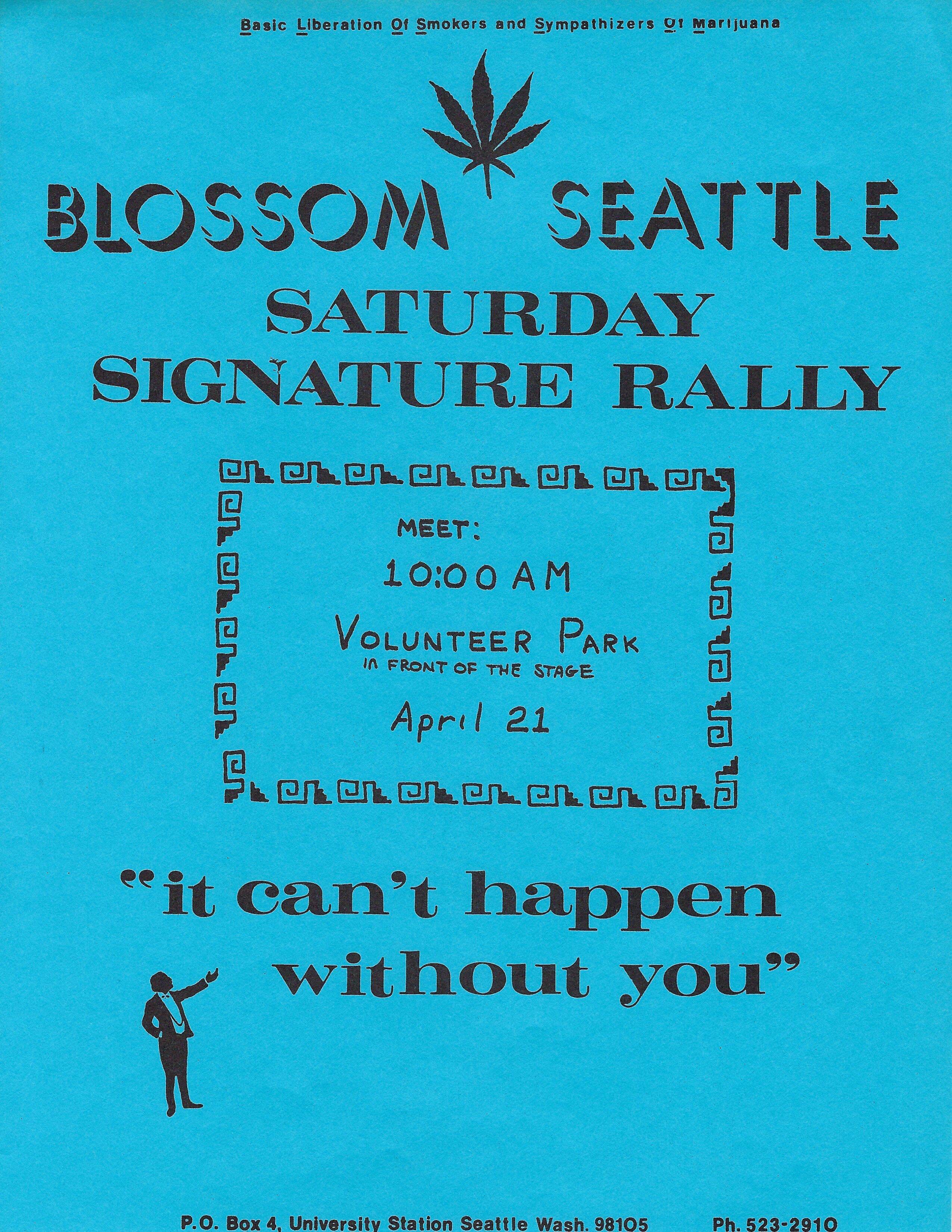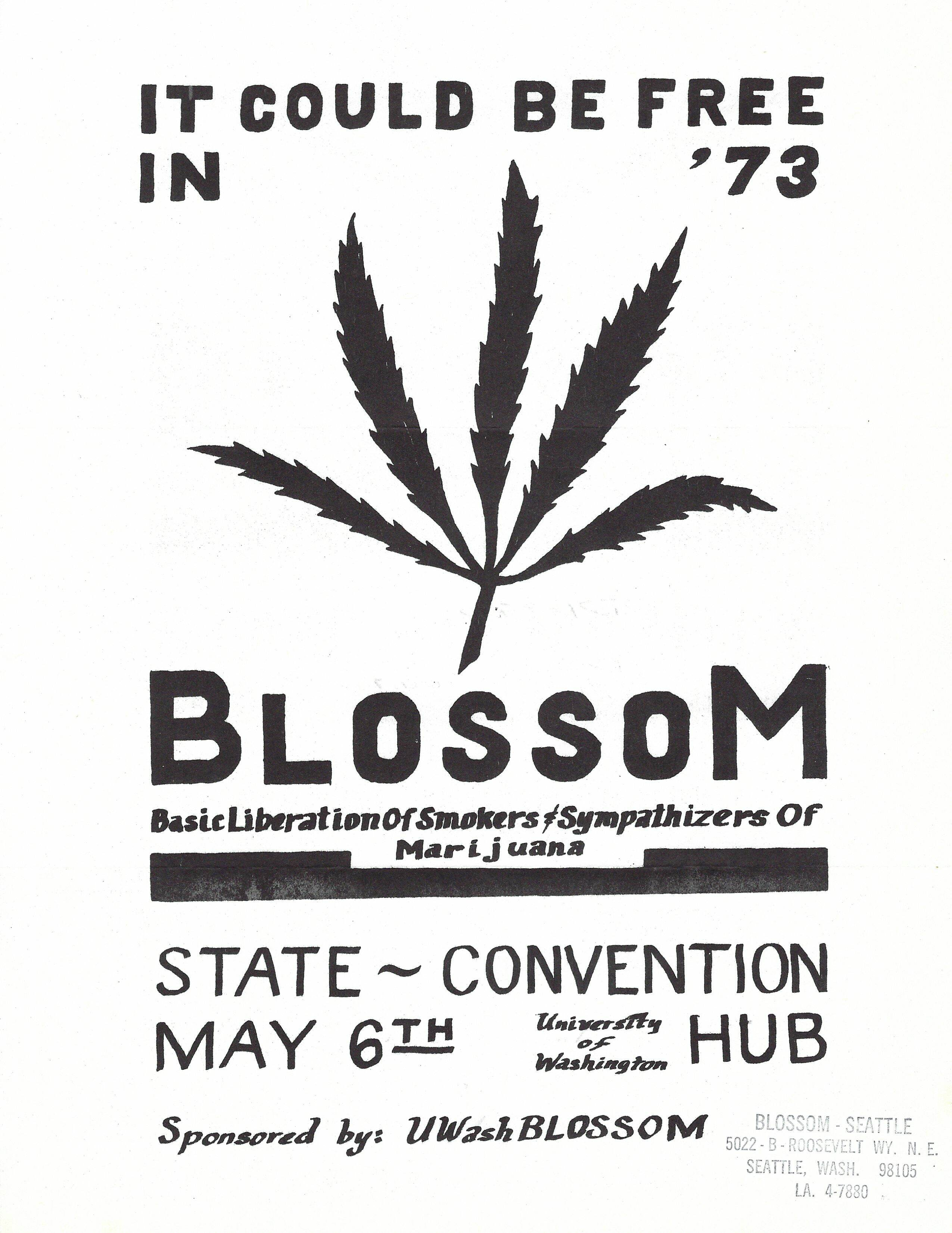 Amidst this burst of local activism emerged another colorful group known as BLOSSOM. Formed in 1971, BLOSSOM stood for the Basic Liberation Of Smokers & Sympathizers Of Marijuana. While the BLOSSOM saga has been relegated to the dustbin of local history, the group pioneered the way for Washington becoming one of the first states to legalize the recreational use of marijuana.
