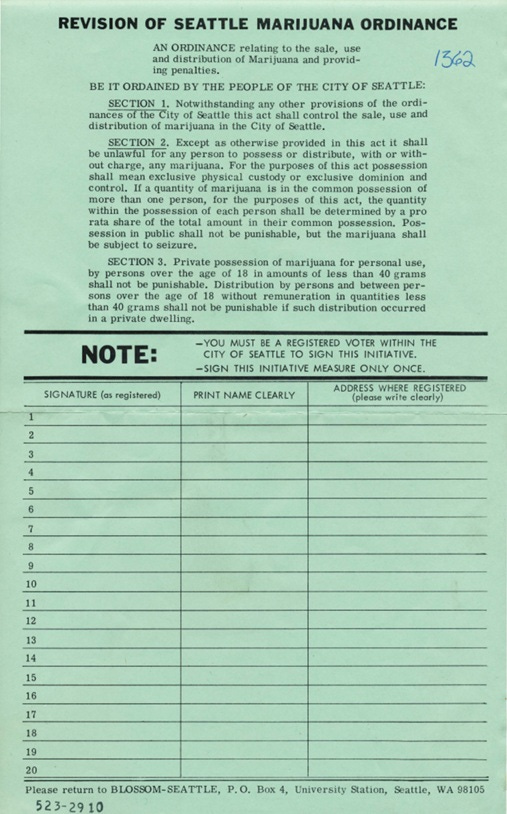 Taking inspiration from such grass-roots efforts as the “Friends of the Market” campaign, which was successfully able to save the Pike Place Market from demolition with a voter-approved initiative in 1971, BLOSSOM attempted the same thing with a local initiative which would permit adults to legally possess and sell marijuana within city limits. With the fuse now lit, work on the so-called Seattle BLOSSOM initiative began in early 1973.