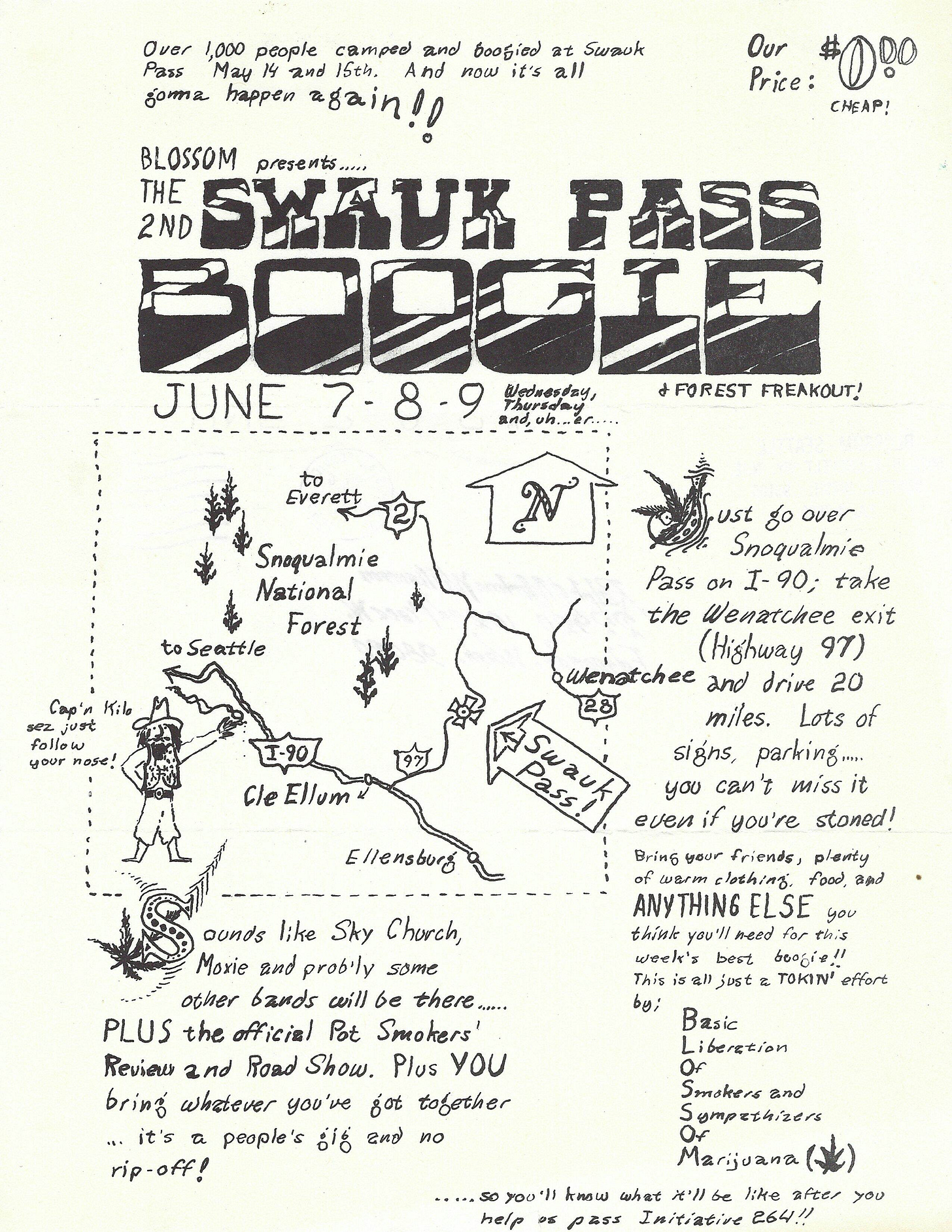 With a growing army of volunteers, BLOSSOM began the grueling task of collecting the 20,000 signatures that were needed to get their initiative on the Seattle ballot. At the time, the idea of decriminalizing marijuana was a very contentious issue and for every positive comment that that signature gatherers received, they were met with an equal number of angry responses. The volunteers quickly learned that there were good and bad places to petition, with any street corner near a bookstore and or coffee shop becoming favored spots. They also held a number of fund raisers featuring local bands and musicians playing at some of the more popular taverns and summertime street fairs.