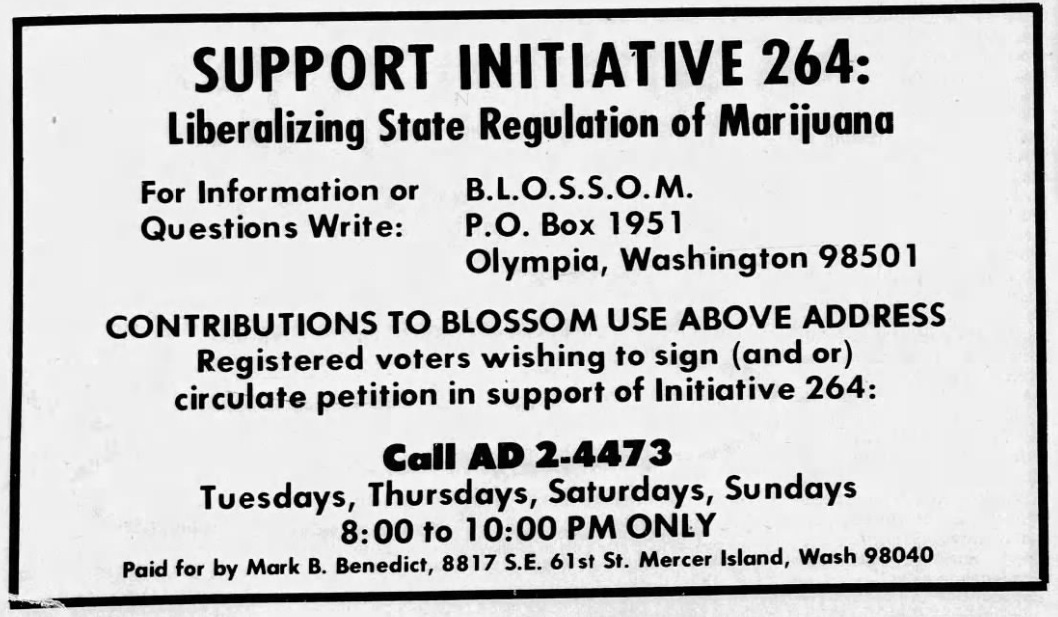 Sometime in early 1972 the group decided to try and legalize marijuana at the state level, which is when BLOSSOM was formally established. From their headquarters in downtown Olympia, BLOSSOM immediately began the task gathering enough signatures to put Washington State Initiative 264 on the ballot which, if passed, would remove all penalties for the use and sale of marijuana as well as release all state prisoners who were imprisoned on marijuana charges. Once word of this project got out, other BLOSSOM chapters quickly opened in Seattle, Tacoma and Spokane, helping to gather signatures and further the group’s mission.